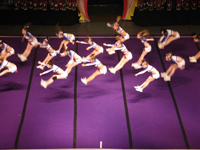 So it is written! East Coast Nitros Bombshells are national Champs! Last Saturday in the Hershey Park Arena (a perfect venue for another live action Scooby Doo movie... this place is creepy and kinda old and fulla nooks and crannies), where the street lights are chocolate kisses, I watched and documented the Bombshells get the highest score of the day and achieve national recognition! I absolutely could not be prouder of my Nikki! She kicks so much ass it is a crime. She set me up with some fries and a spot up top where I could video tape and photograph the entire proceedings without looking like too much of a perv! So, I video taped all Nitro teams (all of which won, by the way, they really outclass all comers), and we are working on the transfer, but I photographed everybody else, so these shots are non-Nitro, and rather PA Elite All Stars, Top Flight Gym, TNT Gym, Valley All Stars, Diamond Gym, KATS Extreme, etc... Now, I was not comfortable gettin' down in the mix, so I have sole angle shots from my perch, and as I got more in the groove, I aimed for tricks (a.k.a. stunts) achieved and syncronised herkies! Great job by all squads, seriously, and so much fun too! Thanks Nikki for turning me onto new awesome things!
